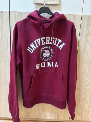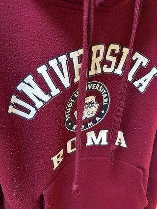 Sudadera con capucha de la Universitá Roma. - Color rojo con detalles blancos. - Diseño con escudo y texto. - Bolsillo frontal.
