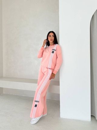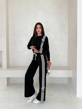 Conjunto deportivo de dos piezas para mujer. - Sudadera con detalles de las icónicas tres rayas. - Pantalón ancho con las tres rayas a juego. - Cordón ajustable en la cintura del pantalón. -desde la S asta la xl