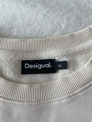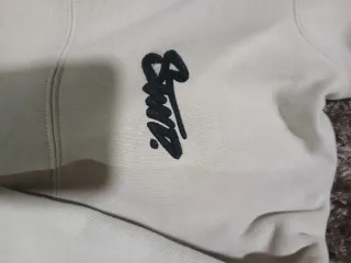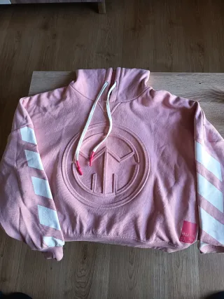 Sudadera con un diseño moderno y llamativo. - Detalle de logo en relieve en el pecho. - Rayas blancas en las mangas. - Cordones blancos con detalles rosas en los extremos. - Etiqueta roja con texto en la parte inferior.Lleva pelito suave por dentro es calentita,solo usada en una ocasión.