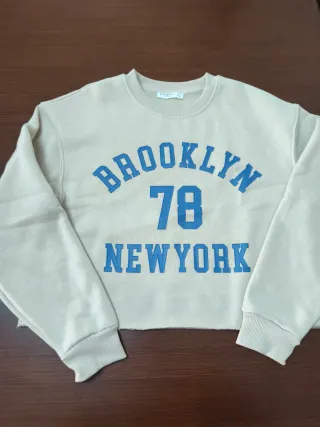 Sudadera corta de color beige con estampado. - Diseño Brooklyn 78 New York. - Cuello redondo. - Manga larga. - Bajo deshilachado.