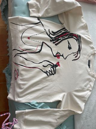 Sudadera con un diseño artístico y moderno. - Dibujo de figura femenina con trazos en negro y rojo. - Cuello redondo y manga larga. - Puños y bajo acanalados.