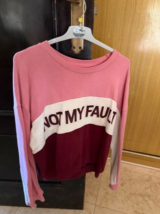 Sudadera con un diseño moderno y llamativo. - Diseño de tres colores: rosa, blanco y granate. - Inscripción Not My Fault en la parte central. - Cuello redondo y mangas largas.