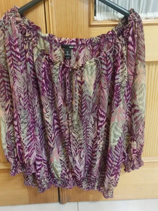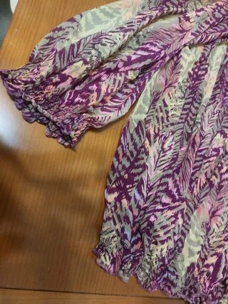 Suéter de manga larga con un estampado vibrante y llamativo. Perfecto para añadir un toque de color a tu armario. - Diseño con estampado de hojas y plumas. - Mangas largas abullonadas con puños elásticos. - Tejido ligero y fluido.