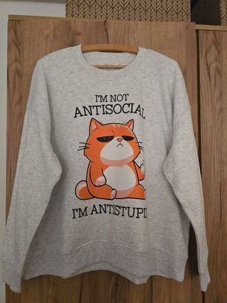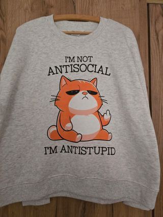 Diferentes tallas Sudadera gris con un diseño original y divertido de un gato con un mensaje. - Estampado de gato con gesto - Mensaje: I'm not antisocial, I'm antistupid
