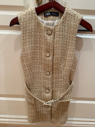 Chaleco de la marca Zara con un diseño elegante. - Tejido texturizado en tonos beige y marrón. - Cierre de botones frontales. - Incluye cinturón a juego. - Bolsillos frontales.