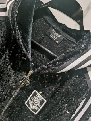 Sudadera con un diseño llamativo y lleno de brillo. - Detalle de lentejuelas por toda la prenda. - Rayas deportivas en las mangas. - Cremallera frontal.