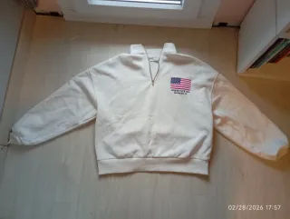 Jersey blanco de Stradivarius con un diseño inspirado en la bandera de Estados Unidos. Está totalmente nuevo y sin usar, me lo regalaron y al final nunca lo usé. - Cremallera frontal. - Detalle de bordado de la bandera USA. - Inscripción Sports Club 1974 San Francisco, CA.