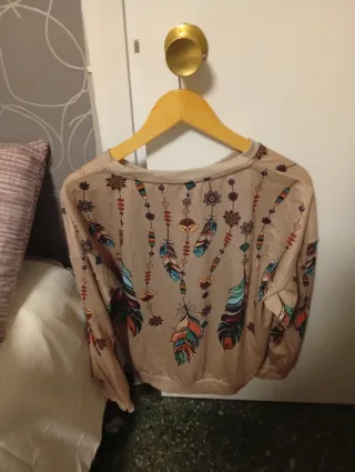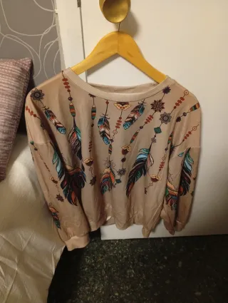 Sudadera con un diseño original y llamativo. - Estampado de plumas y detalles tribales. - Cuello redondo. - Puños y bajo elásticos.