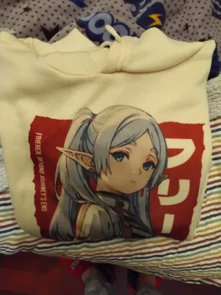 Sudadera con estampado de Frieren. - Diseño frontal con personaje. - Detalle de texto vertical en rojo.