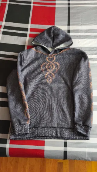 Sudadera unisex con un diseño llamativo. - Tejido principal en gris con detalles dorados. - Estampado ornamental en la parte frontal. - Motivos decorativos en las mangas.