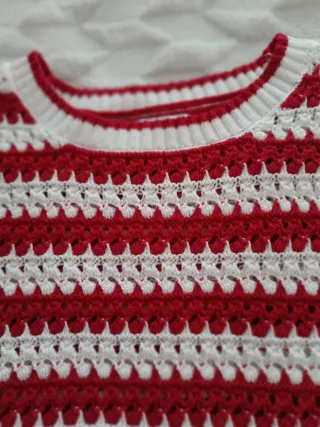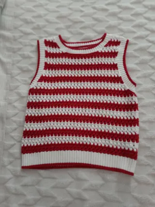 Chaleco de punto con un diseño a rayas rojas y blancas. Es una prenda versátil y cómoda. - Tejido de punto. - Diseño a rayas. - Sin mangas.