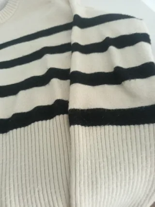 Jersey de punto con diseño de rayas horizontales. - Diseño de rayas verticales. - Cuello redondo. - Manga larga. - Muy cómodo. - Diseño ancho y no es una talla pequeña.