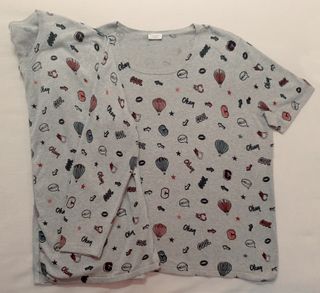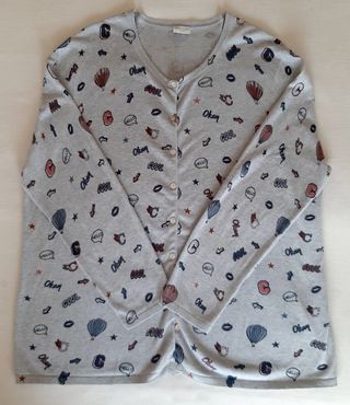 Conjunto de chaqueta manga larga mujer gris claro abotonada y jersey cuello redondo y manga corta de la firma Gerry Weber. Estampado de iconos. Talla 48. Diseño atractivo y juvenil. Medidas: de sisa a sisa: 64 cm. Largura: 74 cm. Muy estiloso, ideal para primavera.