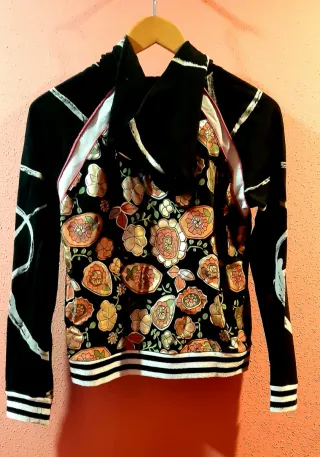 Sudadera con un diseño llamativo y original. - Estampado frontal de dos perfiles de rostro. - Detalles plateados y dorados, y rosas en el diseño. - Mangas con detalles lineales grises. - Puños y cintura con rayas blancas y negras.