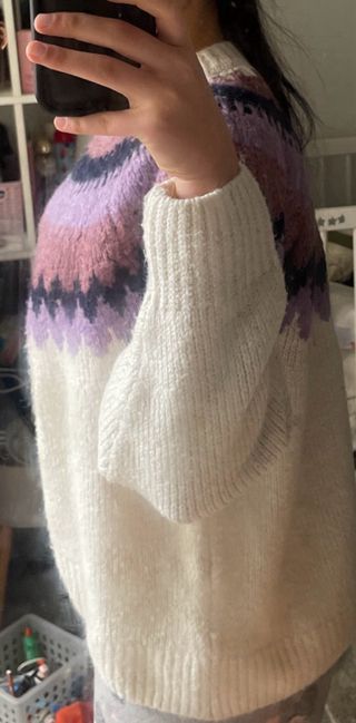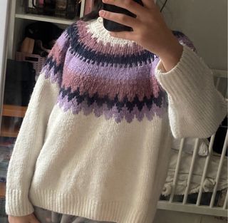 Precioso jersey de lana con un diseño de grecas en la parte superior. - Diseño de grecas en tonos lila y morado. - Mangas y parte inferior en color beige.