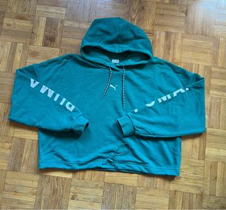 Sudadera estilo crop de Puma en color verde. Cuenta con capucha y cordones ajustables. - Diseño crop. - Capucha con cordones. - Logo de Puma en el pecho. - Estampado de logo en las mangas. - Talla M.