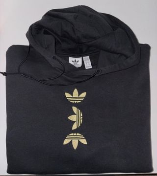 Sudadera con capucha de Adidas en color negro y detalles dorados. - Diseño con tres logotipos de Adidas apilados bordados. La espalda logo en dorado serigrafiado. - Cordones ajustables en la capucha. Afelpada. Con muy poco uso.