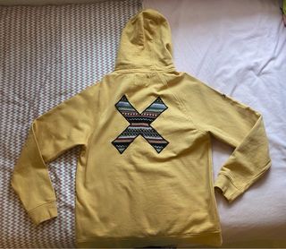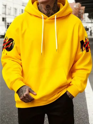 Sudadera de la marca Blue Banana, con un diseño llamativo en la parte delantera. - Color amarillo vibrante. - Estampado frontal con diseño geométrico. - Capucha con cordones. - Bolsillo canguro.