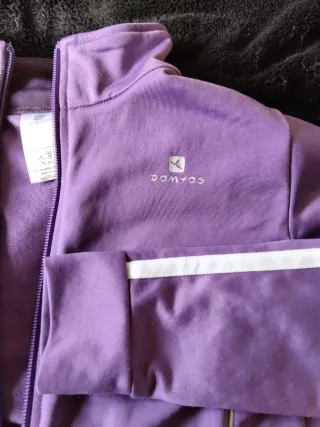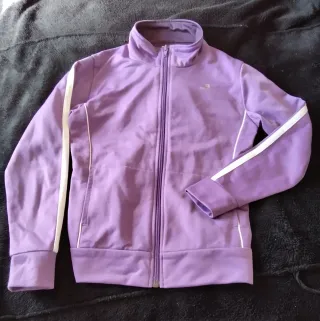 Sudadera deportiva para niña de 8 años. - Color lila. - Detalle de rayas blancas en las mangas. - Cremallera frontal. Bastante buen estado