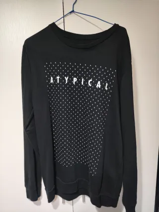 Sudadera negra con un diseño moderno y llamativo. - Cuello redondo. - Manga larga. - Estampado frontal con pequeños puntos blancos y el texto ATYPICAL.