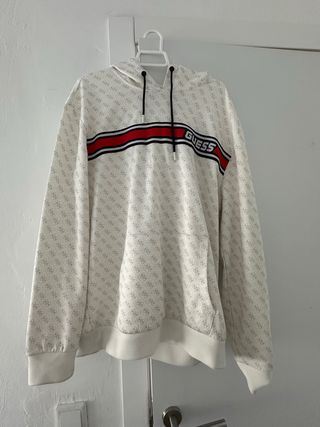 Sudadera con estampado integral de la marca Guess. - Diseño con banda horizontal roja y negra en el pecho. - Capucha con cordones negros. - Puños y bajo de canalé.