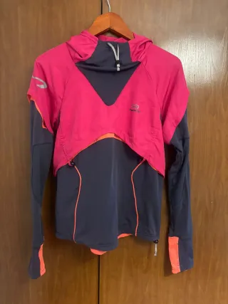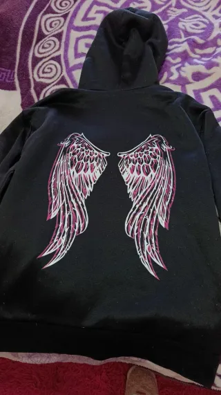 Vendo sudadera con estilo de alas con capucha. Tiene forro térmico. Talla S. 100% poliéster. La vendo por falta de uso, solo usada un par de veces.