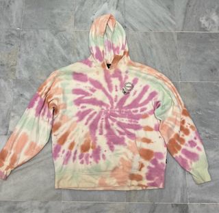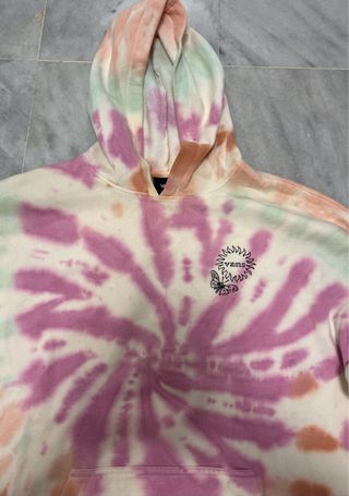 Sudadera con un llamativo diseño tie-dye en tonos pastel. Es talla Small pero es bastante ancha. - Estampado en espiral con colores como rosa, naranja y verde menta. - Logo de Vans en la parte frontal. - Bolsillo canguro.
