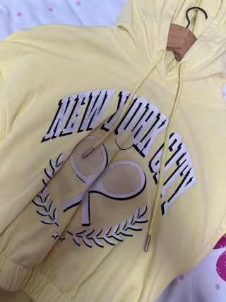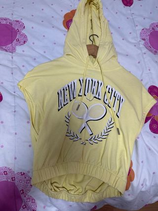 Sudadera con capucha y diseño de New York City con detalle de raquetas de tenis. - Diseño sin mangas. - Cordones ajustables en la capucha. - Bajo elástico.