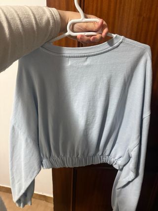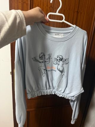 Sudadera corta de color celeste con un diseño de ángeles y texto. Me costo casi 20€ - Manga larga. - Bajo elástico. - Cuello redondo.