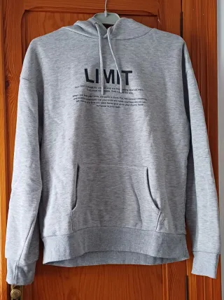 Sudadera gris con un diseño moderno y un mensaje inspirador. - Estampado frontal con la palabra LIMIT. - Bolsillo canguro. - Capucha con cordones. -Precio lote