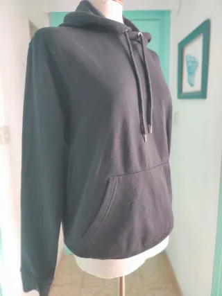 Sudadera con capucha de color negro. - Tejido suave y cómodo. - Bolsillo frontal tipo canguro. - Cordones ajustables en la capucha. - Muy calentita 😊