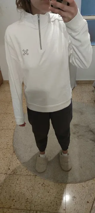 Sudadera de cuello alto caliente. Color blanca y marca en gris. En muy buen estado. - Diseño de cuello alto. - Cierre de media cremallera. - Detalle de logo en el pecho.