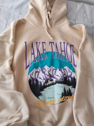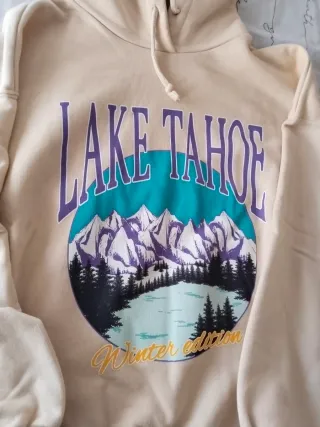 Sudadera con un diseño gráfico de Lake Tahoe Winter Edition. - Estampado frontal con montañas nevadas y bosque. - Texto Lake Tahoe en morado. - Detalle Winter Edition en amarillo. Sudadera ancha para una talla xs/s y m.