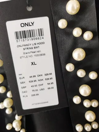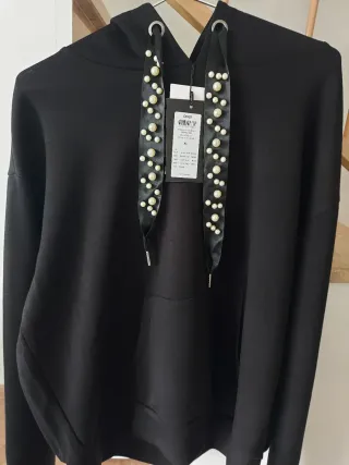 Sudadera de la marca ONLY, talla XL, completamente nueva y con su etiqueta original. - Diseño moderno y cómodo. - Cordones decorados con perlas y detalles brillantes. - Bolsillo frontal tipo canguro.