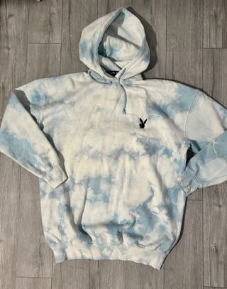 Sudadera con capucha y diseño tie-dye en tonos azules y blancos. Presenta un pequeño logo de Playboy bordado en el pecho. - Capucha ajustable con cordones. - Puños y bajo elásticos. - Estampado tie-dye único. Es oversaze