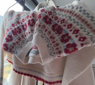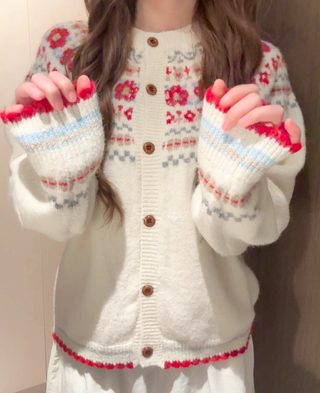 Suéter de punto con diseño floral invernal. - Tejido suave y cálido. - Estampado de flores en tonos rojos y azules. - Diseño de cuello redondo.
