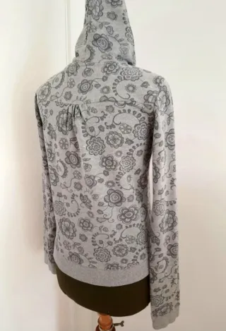 Sudadera con capucha y un bonito estampado floral en toda la prenda Es cómoda y versátil - Cierre de cremallera - Bolsillos delanteros - Capucha con cordones Sudadera de Capucha Estampada De color gris y Estampado gris oscuro 100% Algodón Talla M de Lefties. Es más bien ajustada. Fotos hechas sobre maniqui talla S/M MEDIDAS MANIQUÍ Contorno pecho 85cm Contorno cintura 61cm Contorno cadera 90cm 2 bolsillos laterales delanteros Cremayera delantera Cordón regulable para la capucha Muy buen estado. No se ha usado apenas. Lavada una vez.