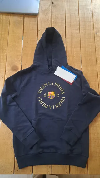 Sudadera con capucha del Barça para niño. Presenta un diseño llamativo con el escudo del club. Talla 14. Sin estrenar. - Capucha. - Bolsillo delantero.