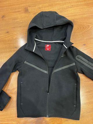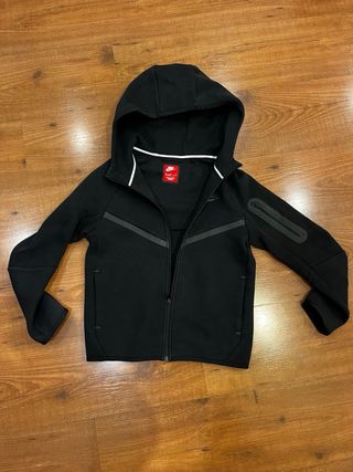 Sudadera Nike Tech de color negro en talla M para niño/a. - Diseño con capucha. - Cremallera frontal. - Bolsillos con cremallera en las mangas. - Detalles reflectantes en diseño de chevron.