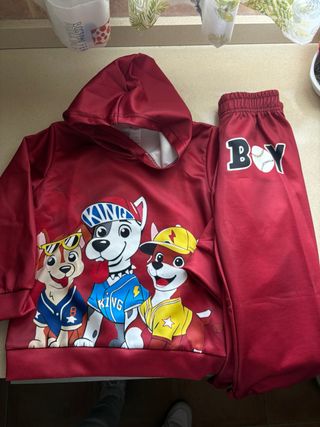 Conjunto de chándal para niño con estampado de perros. - Sudadera con capucha. - Pantalón a juego. - Diseño divertido con personajes.