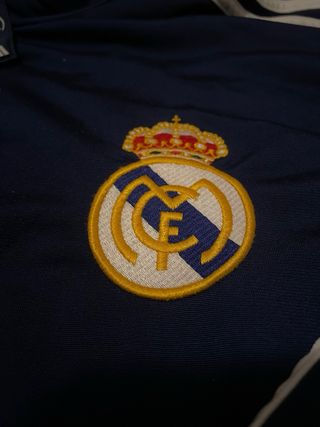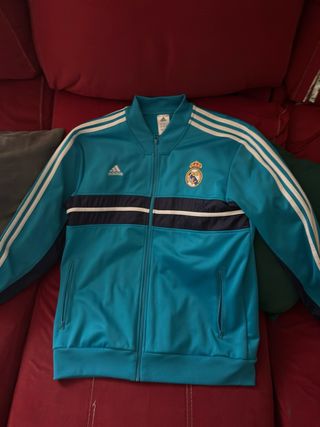 Chaqueta deportiva del Real Madrid con cremallera completa. - Diseño con las icónicas tres rayas en las mangas. - Escudo del equipo bordado en el pecho. - Sin estrenar, con etiquetas.