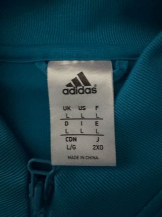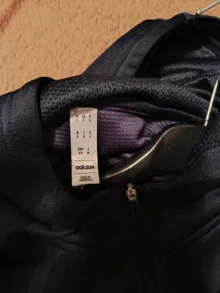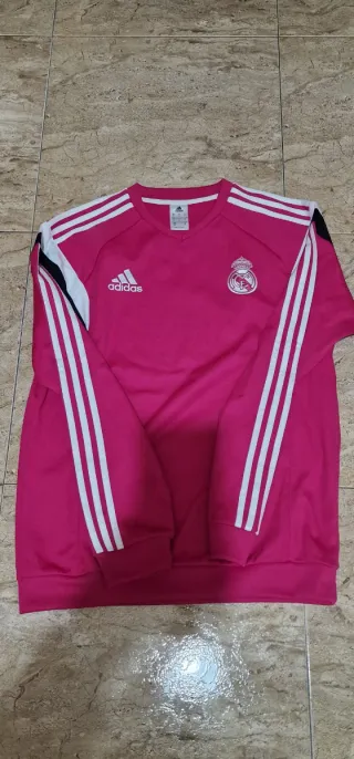 Sudadera deportiva del Real Madrid con el logo de Adidas. Talla L (pero da talla eq como XL) - Diseño con franjas blancas en las mangas. - Detalle de banda oscura en el pecho. - Escudo del equipo bordado.