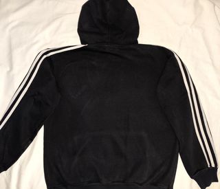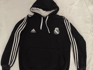 - Sudadera Adidas oficial del Real Madrid en color negro con detalles blancos. Talla M. - Se encuentra en muy buen estado, sin manchas, rotos ni defectos importantes. Producto 100% original. - Diseño clásico con las tres rayas de Adidas en las mangas. - Logo del Real Madrid y Adidas en el pecho. - Bolsillo tipo canguro. - Muy cómoda y abrigada, ideal para uso diario.