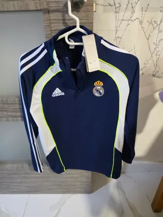 Sudadera deportiva del Real Madrid. - Diseño con cremallera corta en el cuello. - Detalles de las tres rayas de Adidas en las mangas. - Escudo del Real Madrid en el pecho. * Tiene un enganchón en la parte de delante pero no se nota