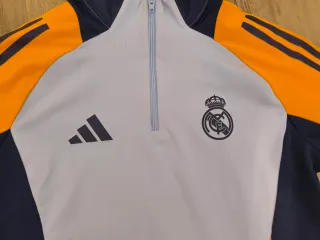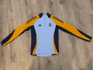 Sudadera de entrenamiento del Real Madrid con un diseño llamativo en naranja y azul modelo Tiro24 - Mangas con detalles de rayas. - Cuello con cremallera. - Logo del club y de la marca visibles. - talla 13-14 164cm