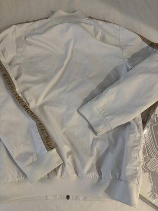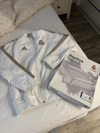 Chaqueta deportiva del Real Madrid oficial!! En perfecto estado. - Diseño con detalles dorados en las mangas. - Cierre completo con cremallera. - Capucha integrada (se puede quitar)