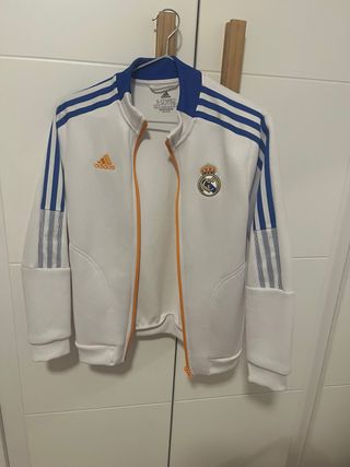 Chaqueta deportiva del Real Madrid con cremallera completa. - Diseño en color blanco con detalles en azul y naranja. - Logo de Adidas y escudo del Real Madrid bordados. - Cremalleras en los bolsillos laterales. - Talla S