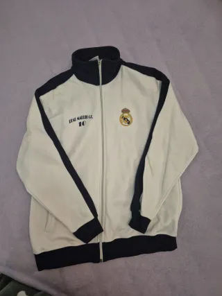 Sudadera oficial del Real Madrid. - Diseño deportivo con cuello alto. - Cremallera frontal completa. - Bolsillos laterales con cremallera. - Detalles de las tres franjas en las mangas. -Logos bordados -Precio negociable
