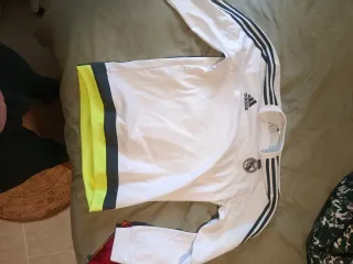 Conjunto de entrenamiento del Real Madrid. - Sudadera blanca con detalles en negro y morado. - Camiseta blanca con detalles en negro y morado. - Logo de Adidas y escudo del Real Madrid. Talla 11/12 años Tiene alguna mancha