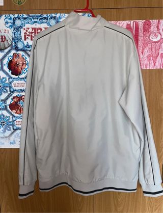 Color: Blanco (con detalles de rayas rojas/grises en el cuello y en las mangas) • Talla: L/50 • Corte: Cuello alto / Chaqueta deportiva • Tejido: Malla interior • Estado: muy bueno.